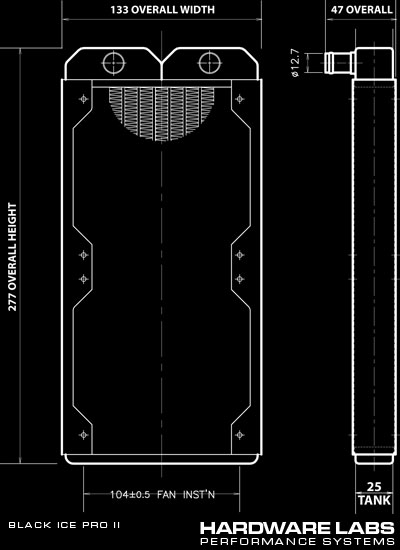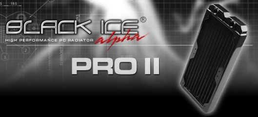 The ultimate radiator for the hardcore case hacker, now with twice the cooling capacity and performance. Based on the same high-performance Black Ice® Platform, the Black Ice® Pro II has all the features of the compact Black Ice® Prime but now sports twice the core area for twice the thermal capacity and is readily configured for dual 120mm fans.