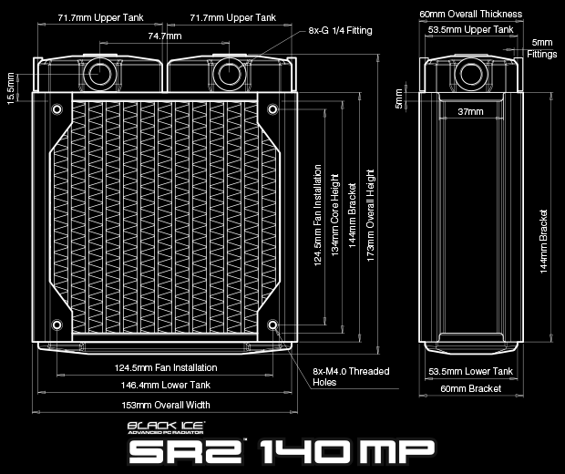The Black Ice® SR2™ MP delivers the next level in ultra-stealth PC radiator performance. Bringing to bear the new Black Ice® SR2™ Xtreme+ platform, the SR2™ 140 MP utilizes 3-rows of air pressure optimized copper fins, complemented with high internal flow tubing to bring class-leading cooling capacity and performance -quietly.