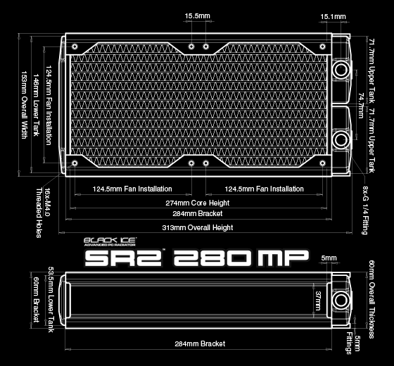 The Black Ice® SR2 MP delivers the next level in ultra-stealth PC radiator performance. The new Black Ice® SR2 280 MP uses the same ultra-stealth optimized Black Ice® SR2 compact Xtreme+ core design in a dual-140mm fan form factor. This gives performance enthusiasts a high flow, acoustically balanced and scalable PC radiator platform.