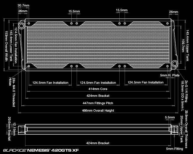The Black Ice® Nemesis® 420GTS® XFlow renders best in class quality and performance for the discriminating casemod professional. Supercruise optimizations exploit low-noise fans for scaled performance in a low-profile triple triple 140mm fan envelope. A newly designed, vectored cross-flow tank enhances flow through impingement type waterblocks for better performance. This allows professional users a single radiator solution for multi-CPU/GPU implementations that simply fits.