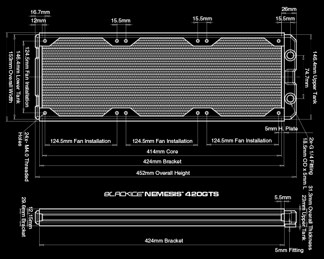 The Black Ice® Nemesis® 420GTS® renders best in class quality and performance for the discriminating casemod professional. Supercruise optimizations exploit low-noise fans for scaled performance in a low-profile triple triple 140mm fan envelope. This allows professional users a single radiator solution for multi-CPU/GPU implementations that simply fits.