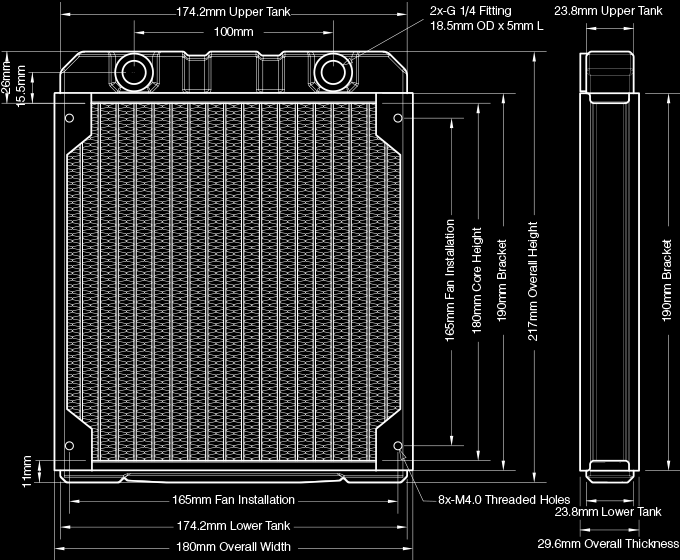 - 180mm x 1 fan slim form factor two-pass radiator.